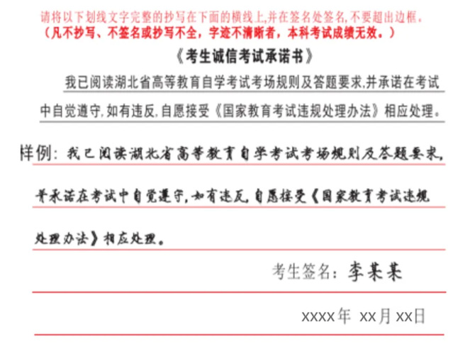 3。测验期间北大门、东门设置考生公用通道,答应考生持测验凭证(测验通知单或身份证)步行或驾车从北大门、东大门进出校园,入校车辆时速需低于30km/h,正在校内不得超速及,严酷恪守学校处的相关。4。考生只能照顾2B铅笔、黑色墨水签字笔、曲尺、三角板、无封套橡皮及无商标纸的饮品等物品进入科场,部门课程可照顾储功能计较器、彩铅等画图东西,其他任何物品(包罗涂改液、批改带)不准带入科场,若有违反,按照违规做弊处置。5。考生正在测验当天不带手机及其他电子设备、不照顾钥匙、磁卡、打火机,金属手镯、戒指、项链等物品,不穿戴有金属粉饰品的衣服、鞋帽、发卡等,避免频频安检,影响一般入场测验。6。考生迟到15分钟不得进入科场(以测验所正在1号、2号讲授楼门口鉴戒线为界)加入当次科目测验,当科测验竣事前30分钟可交卷分开科场。7。落实笔迹消息采集要求。凡不抄写、不签名、不填写日期或抄写不全,笔迹不清晰者,该科测验成就无效。考生结业时,省教育将对每张答题卡上的《考生诚信测验许诺书》笔迹进行复核,凡笔迹不分歧、经判定为的,将按照《国度教育测验违规处置法子》做出成就做废、延迟结业、记入国度教育测验诚信档案等处置。《考生诚信测验许诺书》抄写样例如下图: