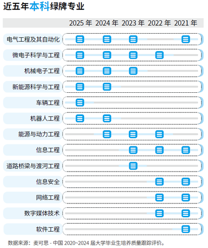 别的值得留意的是,曾正在过去多年一度霸榜的计较机类专业,如消息平安、收集工程、软件工程,近三年来均未进入绿牌专业榜单,显示了财产更迭布景下的专业成长动向,但其就业仍然存正在较着劣势。2025年高职绿牌专业包罗:铁道机车使用取、电气从动化手艺、使用化工手艺、工业机械人手艺、新能源汽车手艺、智能节制手艺,多为配备制制大类专业。此中,铁道机车使用取专业结业生次要处置的是列车司机、机车检修操做人员工做,使用化工手艺次要处置的是化工场系统操做人员等工做,工业机械人手艺专业结业生次要成为工业机械人系统操做人员等,而新能源汽车手艺专业则次要处置汽车电子工程手艺人员等工做。从其职业流向能够看出,这些高职绿牌专业,慎密环绕国度计谋取财产升级需求,构成了对先辈制制业、现代交通系统及绿色经济的全方位支持。从近五年高职绿牌专业榜单来看,铁道机车上榜4次;使用化工手艺、道桥梁工程手艺、铁道工程手艺均上榜3次;工业机械人手艺、铁道机车使用取均为初次上榜。统不雅近年来高职绿牌专业榜单变化能够看出,当前,我国正处于财产升级取科技立异的环节阶段,国度计谋结构深刻影响着各行业的成长标的目的。高职院校的工科专业做为技术型人才培育的从阵地,其专业定位取行业需求慎密联系关系。如正在先辈制制业集群中,工业机械人手艺专业成为智能制制车间数字化转型的环节抓手;正在交通强国计谋驱动下,铁道机车使用取专业聚焦轨道交通配备的运维改革,新能源汽车手艺加快鞭策汽车财产电动化转型历程;面向绿色经济转型,使用化工手艺专业通过优化出产工艺实现化工范畴的节能减排,为碳中和实现和可持续成长贡献力量。