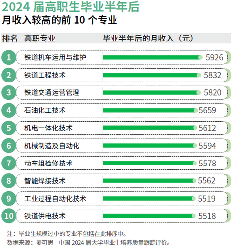 从就业质量维度审视,这些绿牌专业正在薪资程度、岗亭适配度及职业认同感等方面同样表示优良,具体数据彰显出其强劲的就业合作力——2025年的高职绿牌专业均为高职生结业半年后平均月收入排前30位的专业。此中,2024届铁道机车使用取专业的平均月收入为5926元,就业对劲度为85%,工做取专业相关度为84%,别离位列高职次要专业的第1、第7、第7位;2024届使用化工手艺专业的平均月收入为5481元,工做取专业相关度为81%,别离位列高职次要专业的第13、第9位。